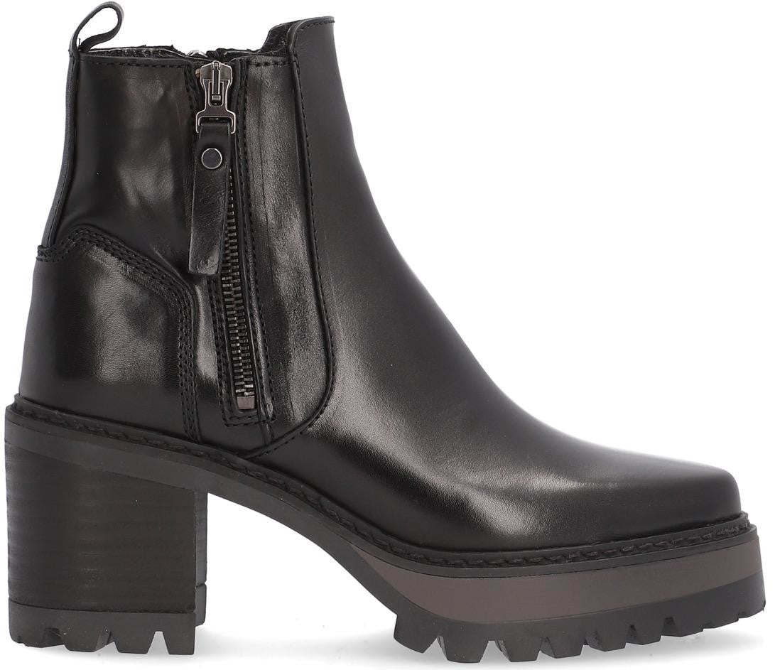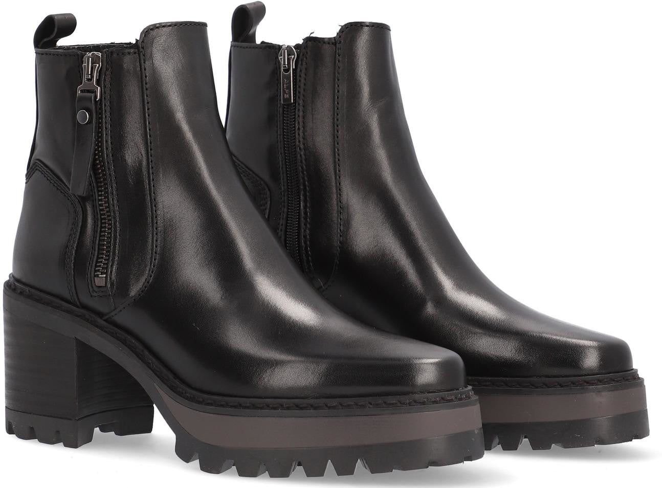 Beautiful ALPE NEW AMELIE women's ankle boot made of black calfskin with a 7 cm heel, non-slip sole and round toe, zipper closure and low-cut style.