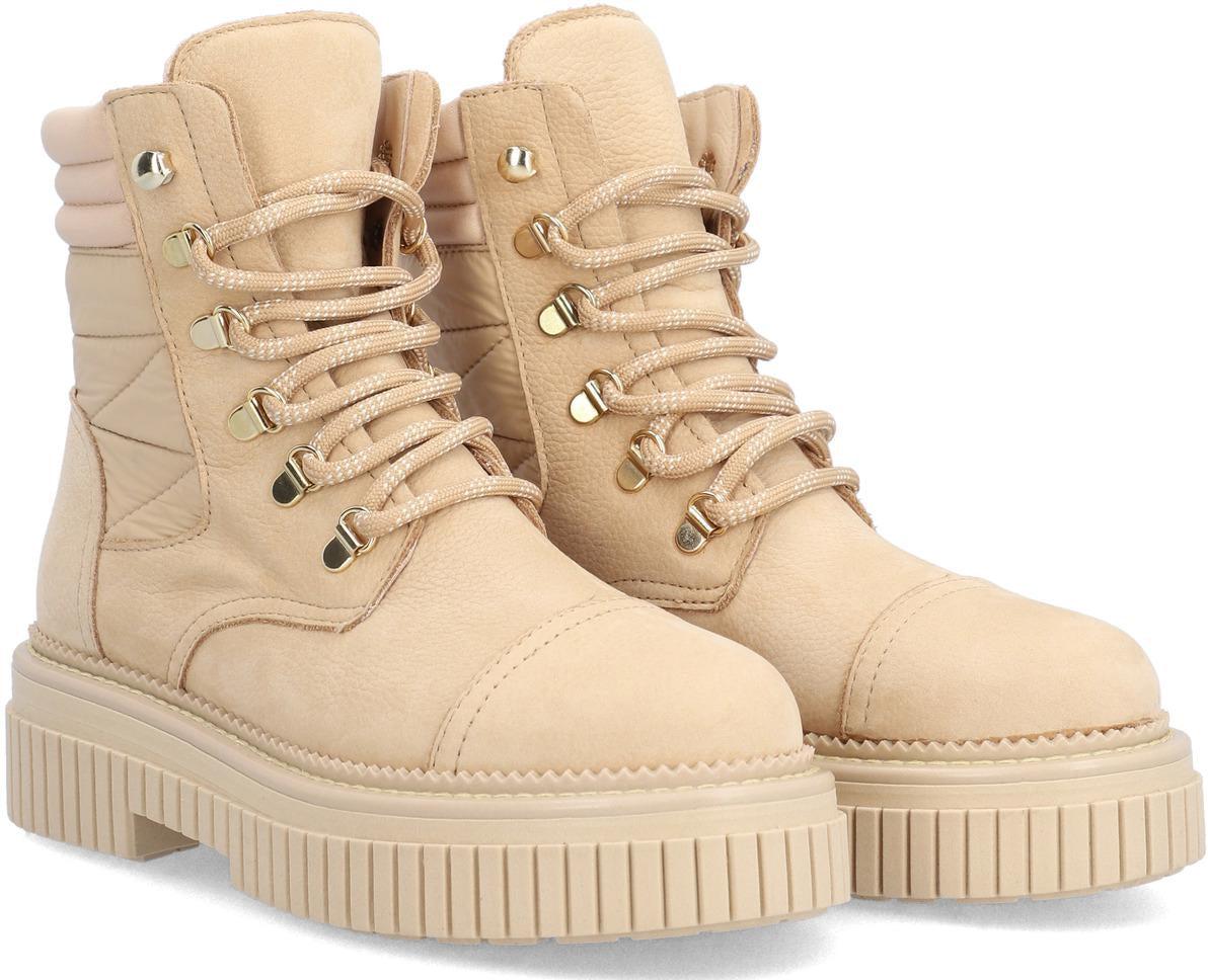 Botte femme ALPE BIMBA, réalisée en cuir nubuck ton cannelle. Il est doté d'une plateforme de 5 cm, d'une semelle antidérapante et d'un bout rond. Elle se ferme avec des lacets et possède une tige basse.