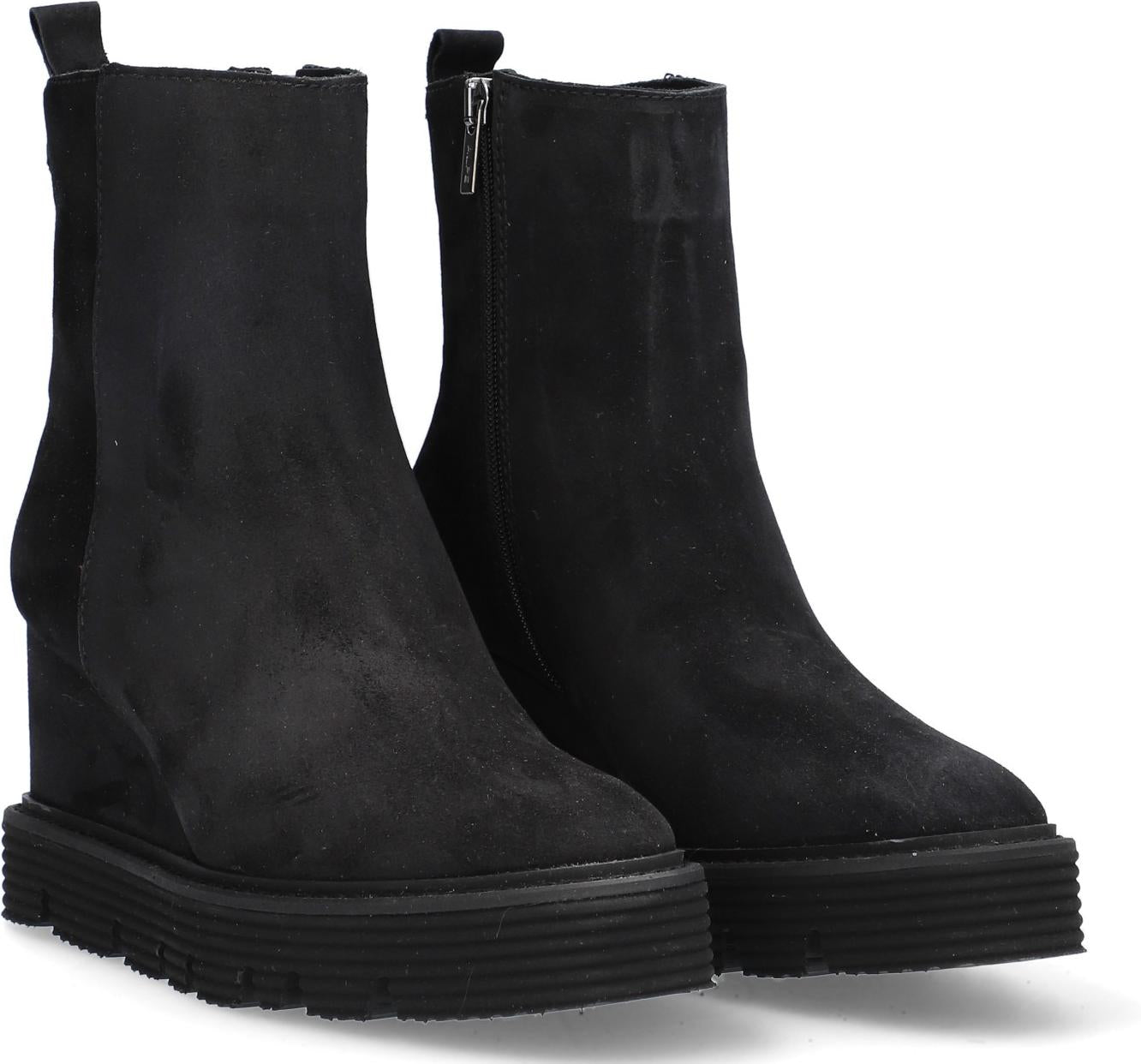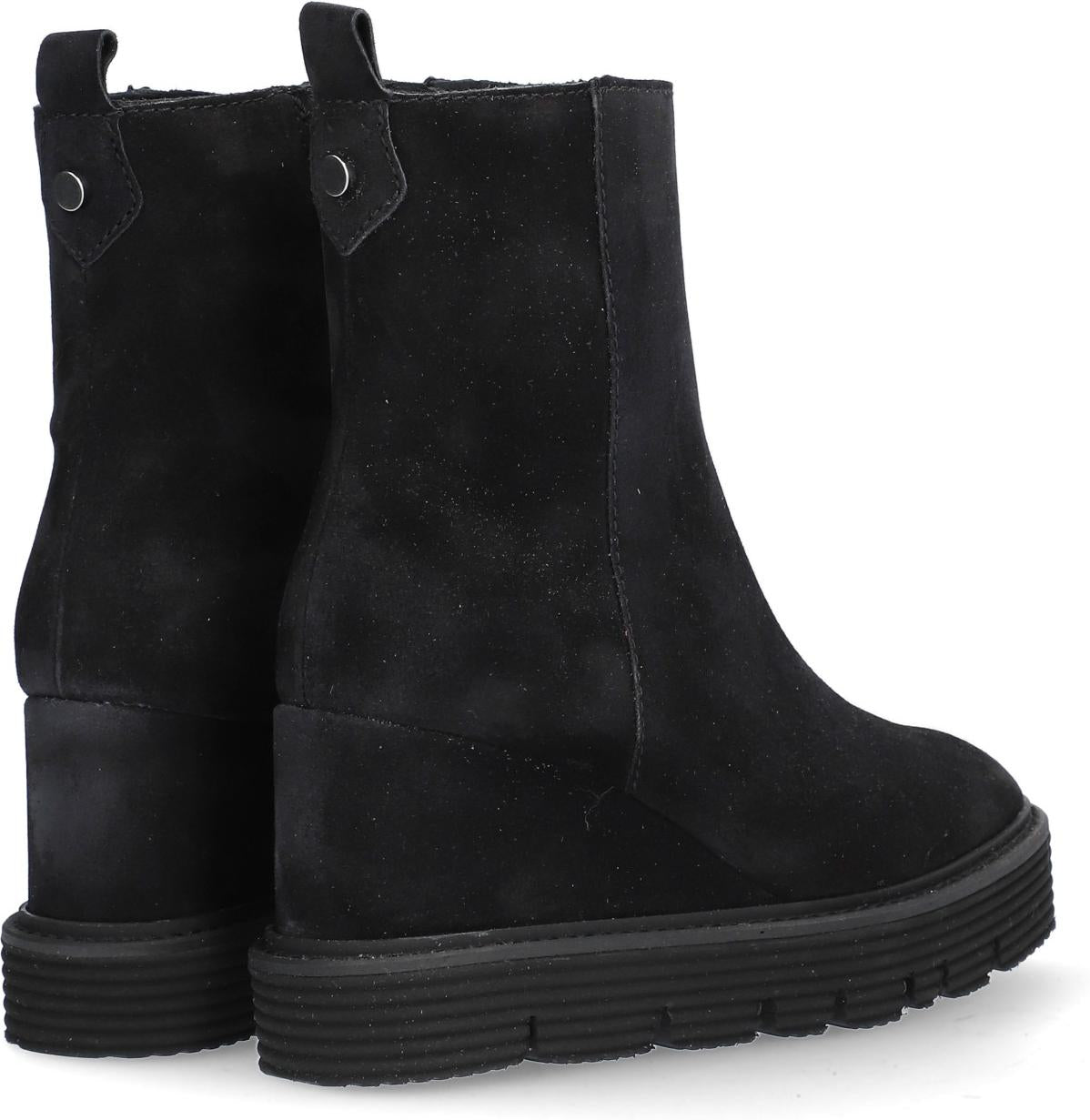 Botín para mujer ALPE SIDNEY, fabricado en piel (baby silk) de color negro con cuña de 8,5 cm, suela antideslizante y puntera redonda, con cierre mediante cremallera y caña media.