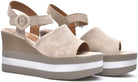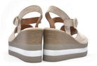 Sandalia para mujer ALPE KENYA, fabricada en piel (baby silk) de color beig con plataforma de 9 cm, suela antideslizante y puntera redonda, con cierre mediante hebilla.