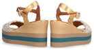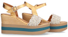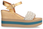 Sandalia para mujer ALPE KENYA, fabricada en piel (campero lame) de color oro con plataforma de 9 cm, suela antideslizante y puntera redonda, con cierre mediante hebilla.